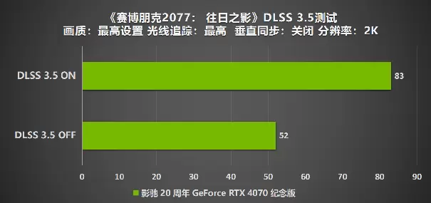 配合上文的画面对比,玩家们不难发现,在开启NVIDIA DLSS 3.5技术后,游戏帧数除了拥有一个明显的上涨以外,通过光线重建技术加持后的画面质量也是更为贴近真实世界的物理光线呈现,修复了许多不合理的光线折射以及投放。通过数据可以得知,在2K分辨率下,影驰 20 周年 GeForce RTX 4070 纪念版 凭借着自身的性能也是可以达到一个52帧的成绩。