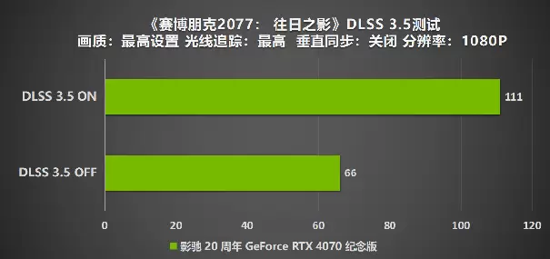 在1080P分辨率下,影驰 20周年 GeForce RTX 4070 纪念版 在《赛博朋克2077:往日之影》中可以轻松达到一个流畅运行的程度。帧数为66帧。玩家们在探索“狗镇”的过程中,可谓是没有任何顾虑,可以轻松畅行。而在NVIDIA DLSS 3.5的技术加持下,帧数更是直破百帧,达到了111帧的成绩。