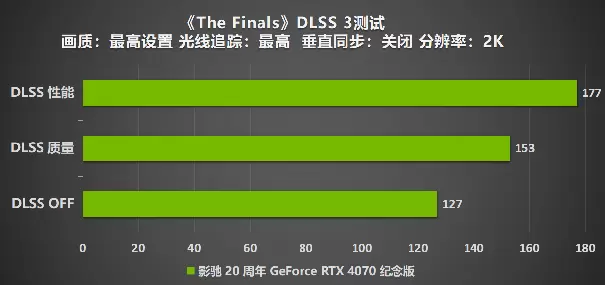 在2K分辨率下,影驰 20周年 GeForce RTX 4070 纪念版 的性能发挥也是显得绰绰有余。凭借着本身的性能加持,帧数可以达到127帧,轻松反应锁定敌人。在NVIDIA DLSS 3质量模式下,帧数则是上涨到153帧;性能模式下达到了177帧的高分。