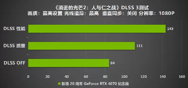 作为一款定位2K的显卡,影驰 20周年 GeForce RTX 4070 纪念版 在未开启技术支持前的帧数也依旧是达到59帧的成绩,让玩家能够稳定流畅的运行《消逝的光芒2:人与仁之战》。开启NVIDIA DLSS 3 质量模式后的帧数则是达到了88帧。在性能模式下的帧数更是拥有了一个翻倍的性能提升,帧数达到了117帧的好成绩。