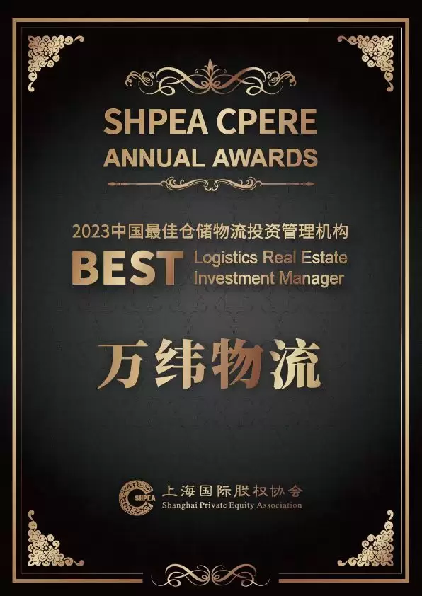 为引导不动产私募股权投资机构更好地服务实体经济发展,上海市国际股权投资基金协会不动产分会于今年首次组织举办了“SHPEA·2023年中国不动产投资与管理大奖”评选工作,结合国内外市场及行业发展情况设置评选维度,根据机构管理规模、投资案例数量及金额、综合回报水平等多角度进行分析和筛选,最后评选出最佳不动产投资服务机构、最佳仓储物流投资管理机构等共计13项榜单。万纬物流凭借专业的资产投资与管理能力,得到评选委员会的高度认可,荣获“2023中国最佳仓储物流投资管理机构”奖项。