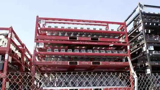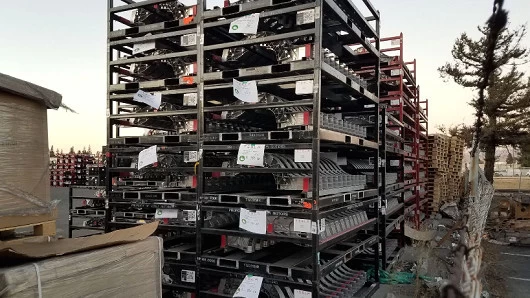 图2:在加州圣何塞的JL Precision机械车间外面,等待返工或装运的特斯拉零件架