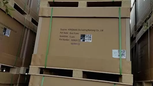 图3:Hong Bang Die Casting为特斯拉铸造的有缺陷车门框,它们被堆放在机械车间的货架上