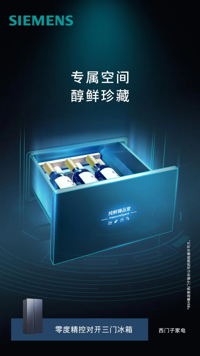 此外,越来越多消费者希望冰箱突破以往存放食材的定位,而可放置更多生活用品、珍藏酒品。为了进一步满足差异化的储藏需求,西门子家电的该款新品在冷藏区内特别设计了臻品储鲜抽屉,打造专属密闭环境,呵护各种臻品。无论是红酒,还是护肤品、保健品,都可以找到合适的存储状态。