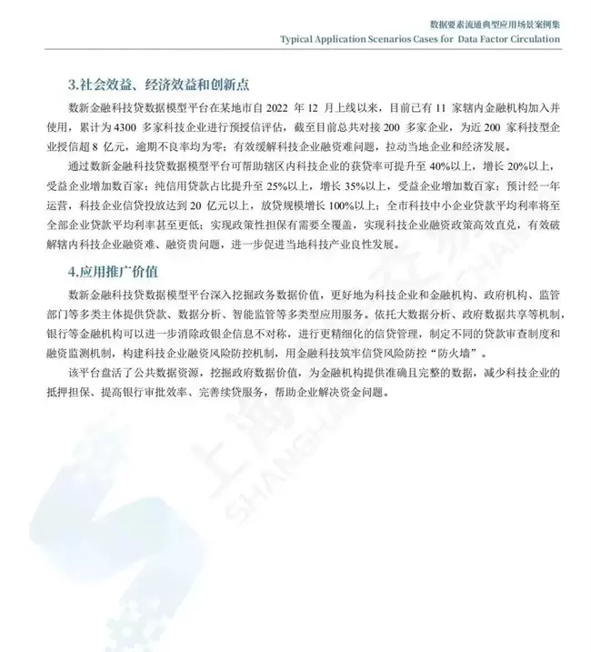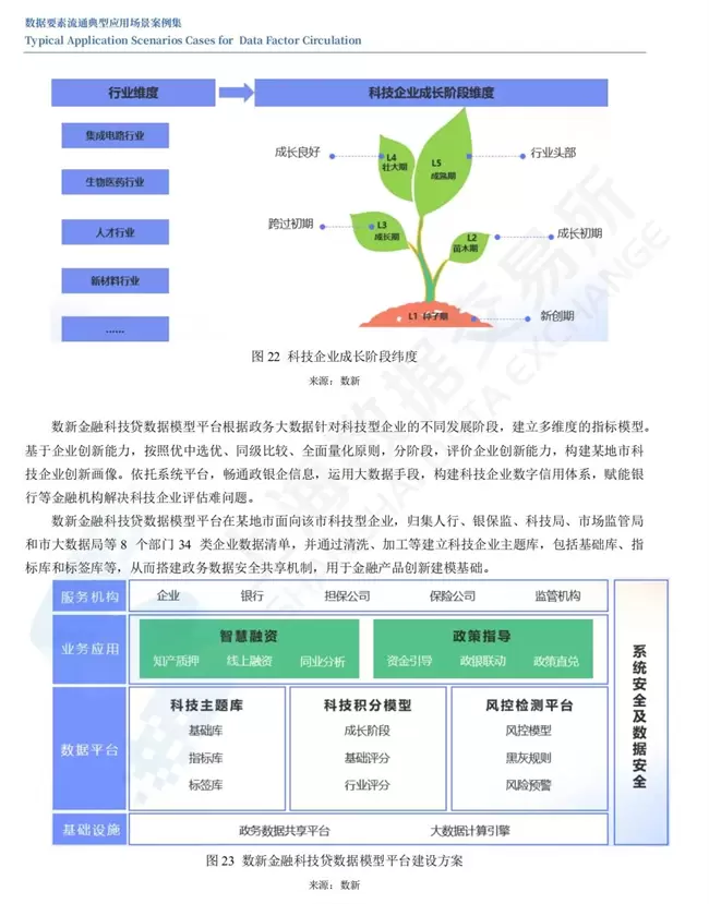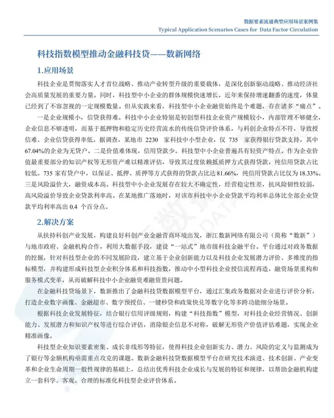 近日,上海数据交易所联合国家工业信息安全发展研究中心和复旦大学,通过征集、调研、资料梳理和专家评审,遴选出28个数据要素流通典型应用场景案例,涵盖工业、金融、医疗、农业、交通、电力、智慧城市和营销八大领域,形成《数据要素流通典型应用场景案例集》,数新网络的科技指数模型推动金融科技贷方案入选。