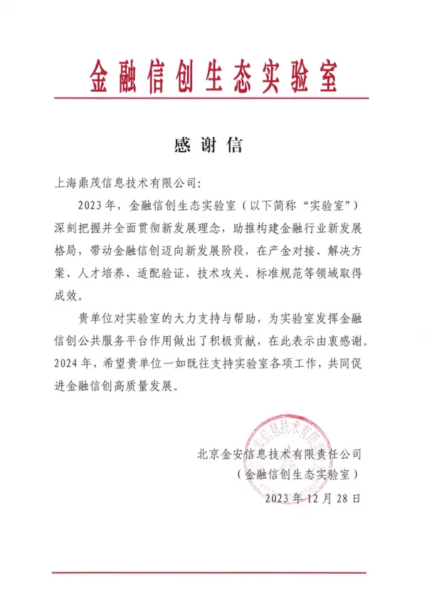 近日,「鼎茂科技」收到金融信创生态实验室(以下简称“实验室”)的感谢信,信中实验室对鼎茂在2023年的支持与帮助表达诚挚的感谢,对鼎茂长期以来对金融信创推广工作所作出的贡献给予了肯定。