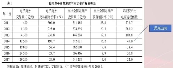 2014年是一个明显的转折点,电子商务交易额急剧增长,而全社会固定资产投资增长率开始从两位数向一位数下滑。