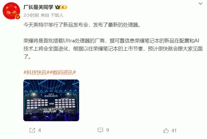 12月15日,2023英特尔新品发布会在北京举行。当天下午,数码博主“厂长是关同学”就爆料:“荣耀将是首批搭载Ultra处理器的厂商,荣耀笔记本的新品在配置和AI技术上将会全面进化,根据以往荣耀笔记本的上市节奏,预计很快就会跟大家见面了。”