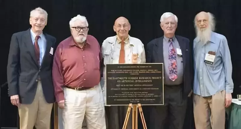 2006年7月,当年参加达特茅斯会议的五位人工智能的奠基人合影纪念人工智能诞生50周年。左起:特伦查德·摩尔、约翰·麦卡锡、马文·明斯基、奥利佛·赛福里奇、雷·索罗莫诺夫。