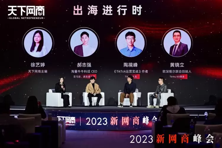 跨境商家圆桌对话,从左至右依次为天下网商主编徐艺婷、海量牛牛科技CEO郝志强、《TikTok运营实战》作者陶境峰、欧深维尔联合创始人黄晓立