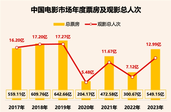 电影市场持续回归繁荣,随着2023年全国电影票房的突破性增长,达到549.15亿元的崭新高度。同比2022年增长83.5%,同比2021年增长16.76%。