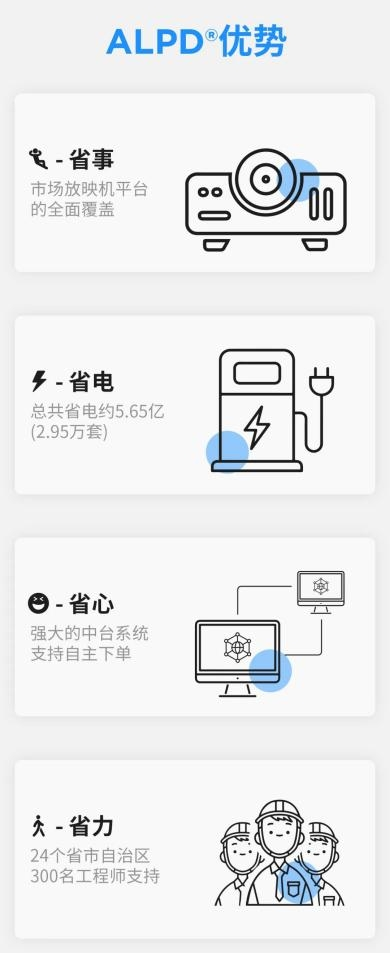 得益于激光光源高亮度、高能效的属性,在同等亮度水平下,相比传统氙灯光源,由光峰科技(688007.SH)自主研发的ALPD激光光源更加节能,可有效降低电费支出。不仅如此,ALPD光源拥有长达3万小时的使用寿命,彻底免除传统氙灯放映机频繁更换灯泡的操作。