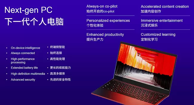 文章中,高通技术公司高级副总裁兼计算与游戏业务总经理(Kedar Kondap)表示,在传统笔记本换新周期以及AI技术的共同驱动下,2024年PC市场将迎来换机“超级周期”。文中引用摩根士丹利市场预测,2024年将有40%的笔记本电脑需要更换,在2025年继续提升到65%。另一个更大的驱动力则来自生成式AI的普及,Conley在文章中也提及,微软的AI助手,例如Copilot,将推动AI PC需求的进一步增长,将为企业和消费者计算体验带来革命性变化。