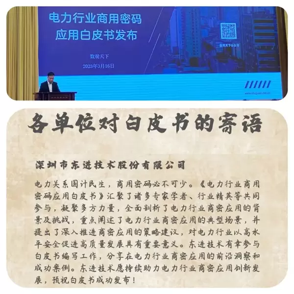 东进技术还参与编写电力行业首部商用密码应用专题研究报告——《2023电力行业商用密码应用白皮书》,分享公司在电力行业商密应用的前沿洞察、产品功能、技术特点、解决方案、成功案例和发展趋势。