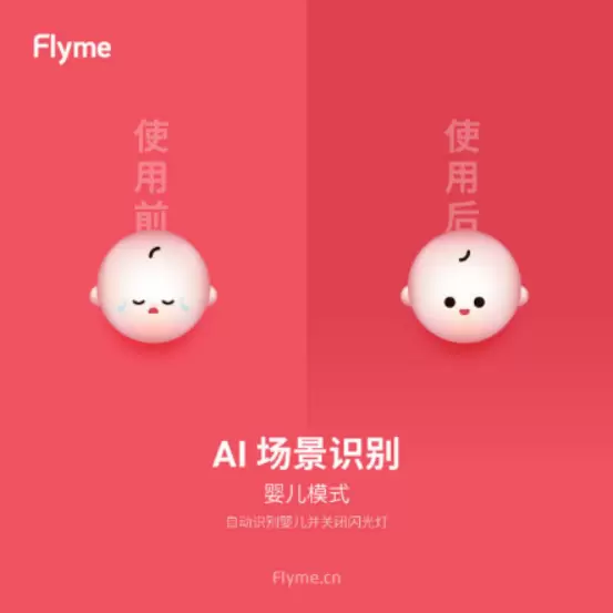 当 Flyme 相机中的 「AI 场景识别」功能识别出拍摄对象为婴幼儿时,会人性化地屏蔽闪光灯;若拍摄者手动打开了闪光灯,系统会进行及时提醒「识别到婴儿,不建议开启闪光灯」,从而避免有可能给宝宝带来的伤害,是不是很贴心?