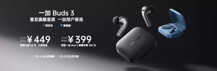 2024开年之际,一加 Buds 3全面普及旗舰音质,并以旗舰降噪、旗舰质感、畅快互联体验打造一加用户首选。一加 Buds 3现已开启预售,售价499元,首销立减50到手仅需449元!搭配一加 Ace 3购买仅需399元!1月8日10:00开启全渠道发售,敬请关注!