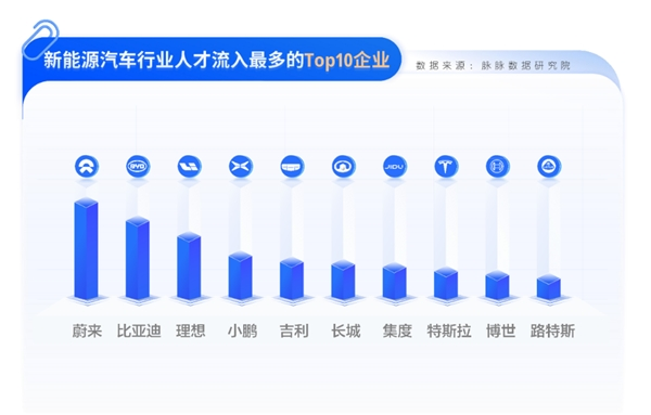 脉脉大数据分析了2022年人才流向最多的新能源汽车企业Top10,排名前三的分别为蔚来、比亚迪和理想汽车。