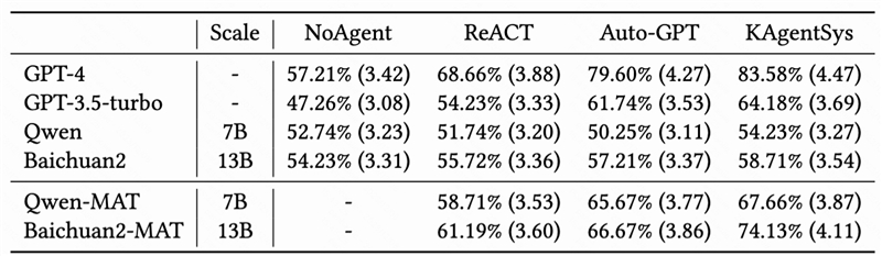 同时,作者们还请人类标注者在200个事实性和时效性的问题(如“刘德华今年几岁了”),对不同的大模型和Agent系统进行了交叉评估,可以看到KAgentSys系统和MAT之后模型提升显著(百分号前为正确率,括号内为5分制均分)。