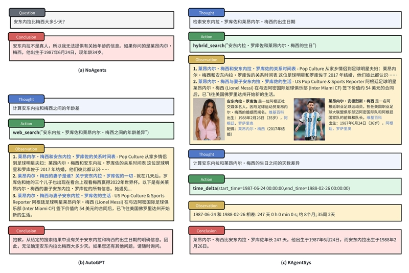 通常仅依赖网页搜索对一些长尾问题和热门问题返回结果不佳。比如问到“安东内拉比梅西大多少天?”这类长尾问题,往往搜索结果返回的都是一些两者的八卦新闻,而返回不了一些关键信息。而KAgentSys 通过调用百科搜索工具获取精准的出生日期,再调用time_delta时间差工具算出年龄差,就能精准回答这个问题了。