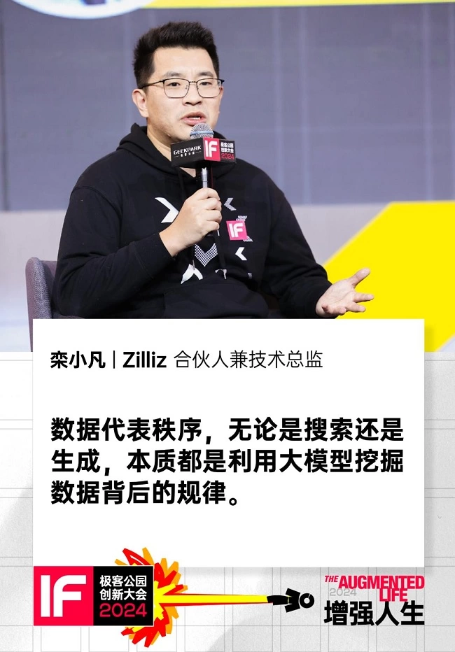 其中,Zilliz 合伙人兼技术总监栾小凡表示,数据代表秩序,无论是搜索还是生成,本质都是利用大模型挖掘数据背后的规律。