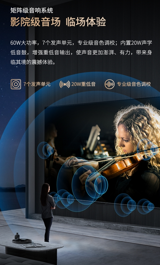 为夏普AQUOS 100英寸巨幕电视极致的画面表现带来声音上同频共振的,是拥有7个发声单元、20W重低音、专业级音色调校的矩阵级音响系统。这能使AQUOS 100英寸的声音更加澎湃、有力,为用户带来身临其境的震撼体验。