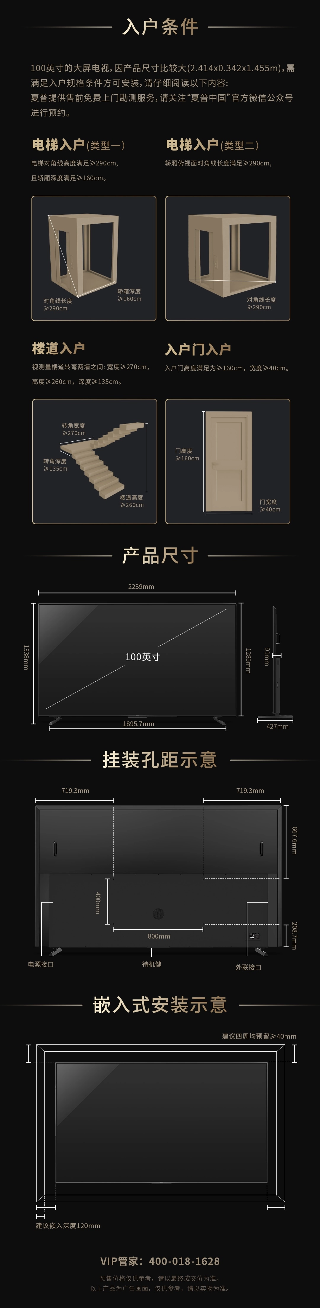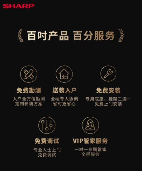 必须要提示所有用户的是,100英寸的巨幕电视尺寸较大,宽度超过2米4,高度超过1米4,入户安装需要考虑入户门、电梯桥箱或楼道的相应空间尺寸,符合条件方可安装。夏普提供售前免费上门勘测及全程送装调试服务,请关注“夏普中国”官方微信公众号或拨打400-018-1628 VIP管家热线进行预约。