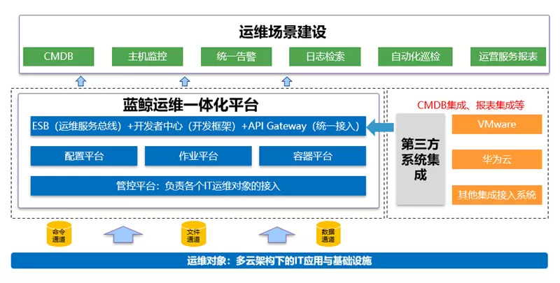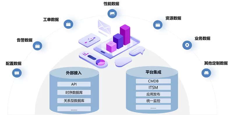 通过PaaS平台+SaaS场景的方式构建一体化运维管理体系,1个基础平台融合了公共能力,支撑场景应用的运行、协同、服务。场景应用包括了配置管理CMDB、IT监控告警、日志平台、自动化巡检、运营服务报表等5大应用,后续可快速、灵活扩展各类应用。