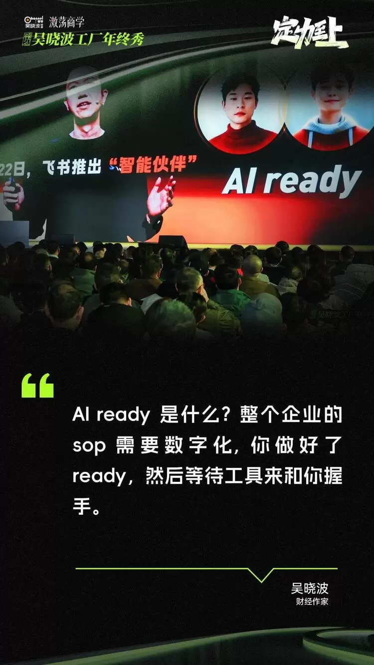 AI大时代无可避免,做好“AI ready”,才能让团队能更快、更充分地利用AI技术,把握时代机遇,实现企业的更高价值。正如吴晓波在其年度演讲最后提到:“在如今这个时代,整个企业的 SOP 需要数字化,只有这样,你做好了ready,然后等待工具和你来握手,来博弈,用工具来提高你的生产效率。所以我觉得对今天来讲,每一家企业,每个人 AI ready 是一件特别重要的事情。”