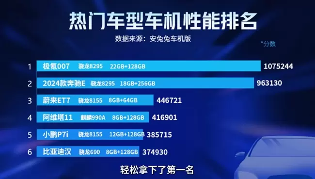 以骁龙8295为代表的第四代骁龙座舱平台采用了5纳米制程工艺,为汽车制造商提供高性能的系统级芯片(SoC),带来更强的图形图像、多媒体、计算机视觉、AI处理等能力,并可与5G、C-V2X等先进的连接技术配合,助力汽车产业伙伴打造全新的智能网联汽车。跑分平台安兔兔公布的车机版性能榜单显示,基于骁龙8295的极氪007凭借着超过100万的分数高居榜首,2024款奔驰E位居第二名,均表现出强大的软硬件处理能力。