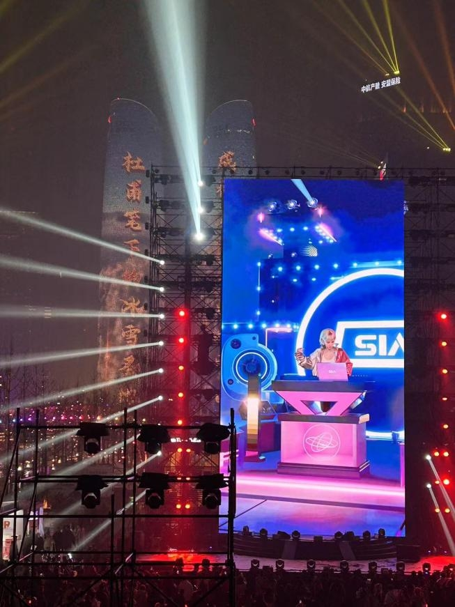伴随实时变换颜色角度的灯光,虚拟数字人“SIA”在成都交子大道的数字大屏幕中,担当了现场DJ的角色,将自己独特的风格融入到表演中,随着电音调律的不断变化,身体和视角跟随摇摆,引导观众沉浸式感受现场热烈的氛围并参与其中。