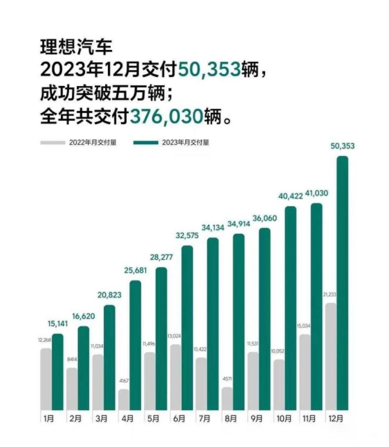 最新数据显示,2023年12月,理想汽车新车交付量达到50353辆,同比劲增137.1%,成功实现月交付5万辆的目标。2023年全年,理想汽车累计交付37.6万辆,成为首个迈过30万辆年交付大关的新势力车企。