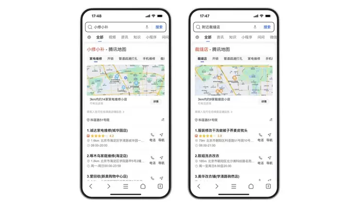 目前,用户在授权地理位置的基础上,只需在QQ浏览器内搜索“小修小补”,或搜索“附近+具体需求关键词”,比如“附近开锁”、“附近裁缝店”、“附近电动车维修”等,即可在搜索结果界面中,看到现有位置附近3000米内的小修小补便民地图。用户可在地图中,切换选择不同类型需求比如家电维修、开锁、裁缝店等等,并能够按需修改地址定位。此外,在地图下方区域,还根据用户选定的需求,推荐展示最合适的店面信息,可以一键拨打电话,或直接进入导航界面指引前往。
