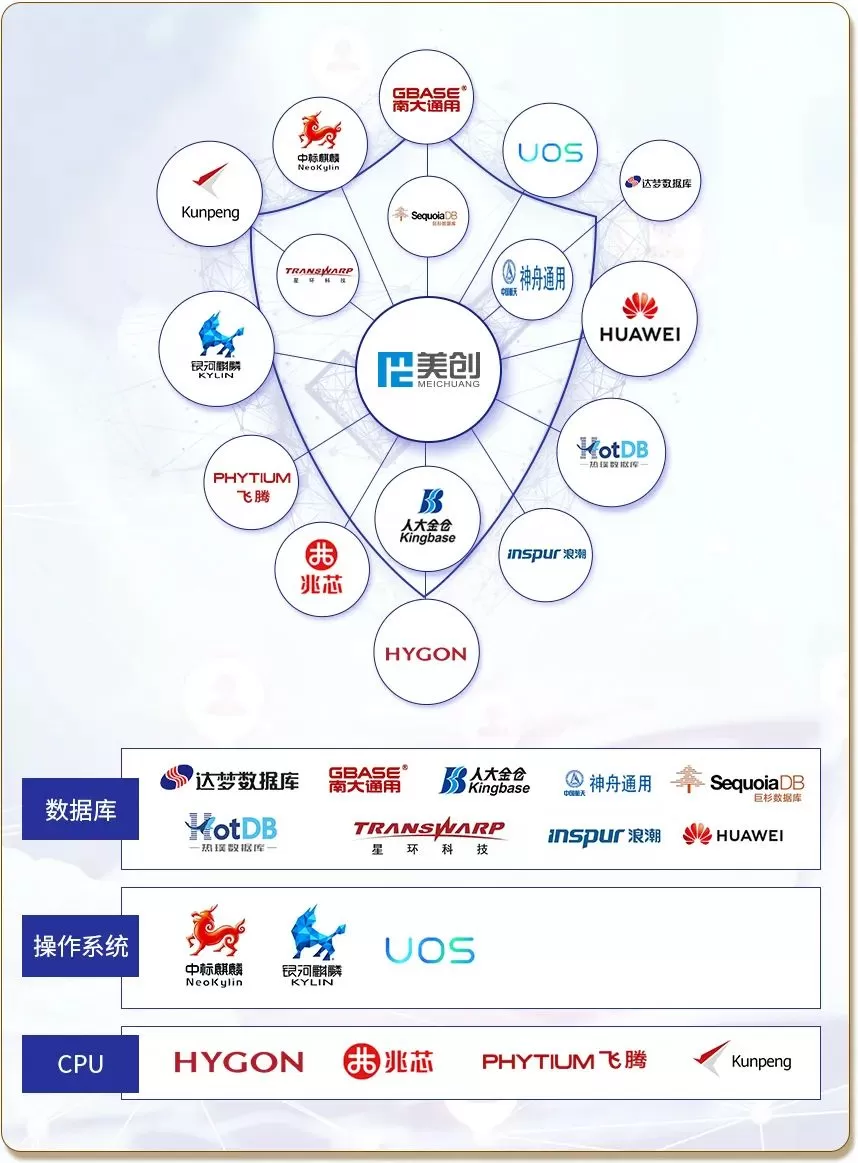 在生态建设上,美创科技秉承共创共建的理念,与云、操作系统、芯片、国产数据库等厂商建立合作,形成统信UOS、海光、麒麟、神州通用、达梦、人大金仓、热璞、华为、浪潮、兆芯等业内优势企业的聚合。