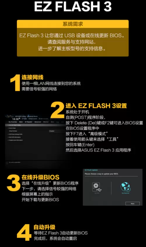 方法二,进入华硕UEFI BIOS的EZ模式,连接华硕官网完成BIOS更新。