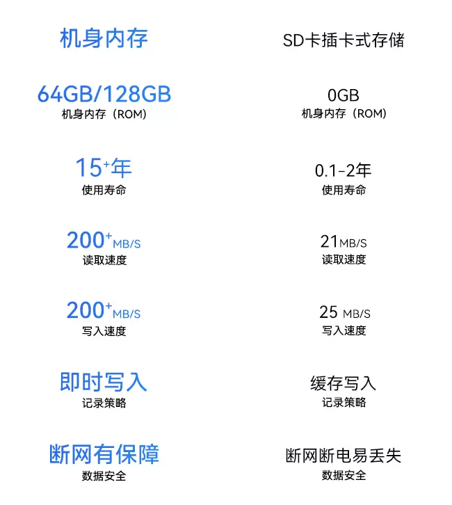 目前市面上其他摄像头大多采用外插SD卡的设计,只有海雀采用的是安全性更强、更稳定、成本也更高的机身内存(ROM),二者在安全和性能上有本质区别。