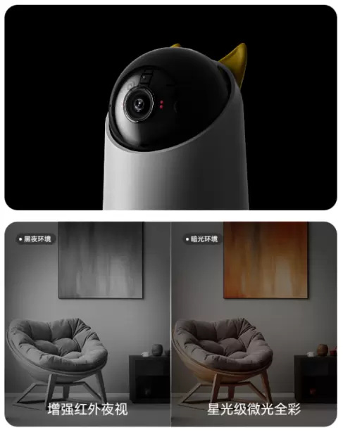 通体雪白身形、双云台灵活转动,外观简洁大气,适配各种家居风格。可拆卸的“耳朵”设计,新增一丝俏皮可爱。