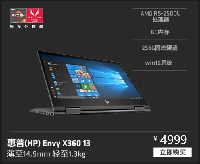 惠普Envy X360 13超轻薄翻转笔记本电脑,采用AMD 锐龙 5 2500U移动处理器,搭配8GB DDR4双通道内存,薄至14.9mm,轻至1.3kg,支持360度翻转触控,配合笔记本、帐篷、平板、站立四种“使用姿势”,随心所欲、随需而变,通吃各种办公应用场景,提升你的工作效率,无论是白领人群还是家庭用户,惠普Envy x360 13 都是一款值得考虑的主力机。
