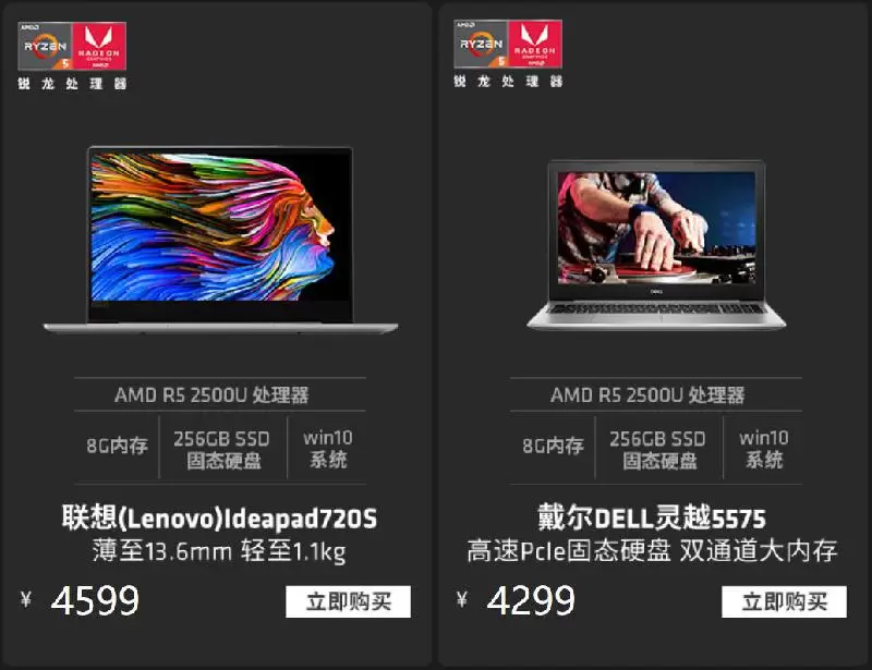 这里还有首款上市的锐龙笔记本联想IdeaPad 720S,它最大的特点是超轻薄的设计,13.6mm和1.1kg的重量让其在轻薄程度上足以比肩高端万元级别轻薄本;戴尔灵越5575之前已经在渠道铺货,256GB的大容量PCIE SSD和双通道内存和锐龙移动处理器堪称最佳组合,足以发挥锐龙处理器的强大实力。