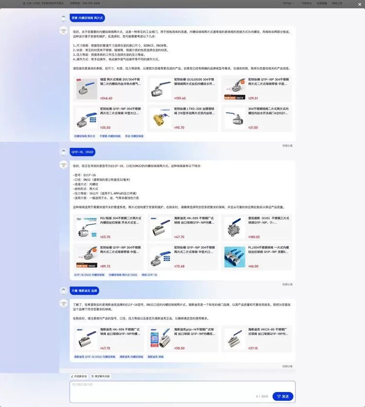 例如能源企业在布设油气管道、安装阀门时,采购人如果不知道该如何选择符合业务场景需求的商品,即可在京东工采“智能导购”对话框中输入所需的品类,如内螺纹球阀两片式,大模型即可反馈该类阀门的特点和典型使用场景,并提示选型时需要重点关注的参数,如尺寸规格、材质、压力等级、操作方式;待采购人按提示明确了具体参数范围,如Q11F-16、DN32等之后,大模型就会推荐符合需求的规格型号并同步相应的商品链接;如果采购人更信任知名品牌的产品质量,大模型还能进一步自动筛选,只推荐相应品牌的产品,帮助采购人快速决策。