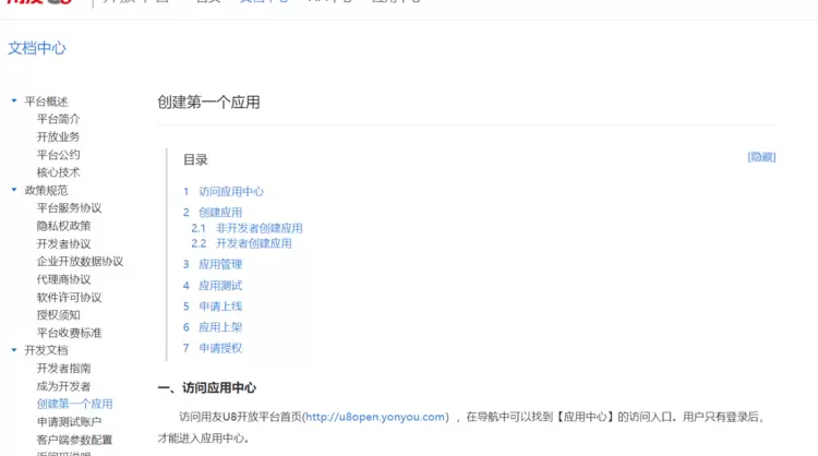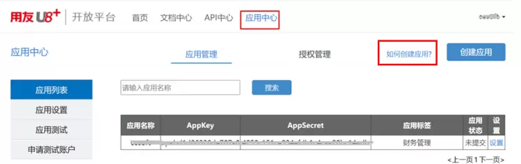 1.1 在用友U8+开放平台注册用户,创建应用。