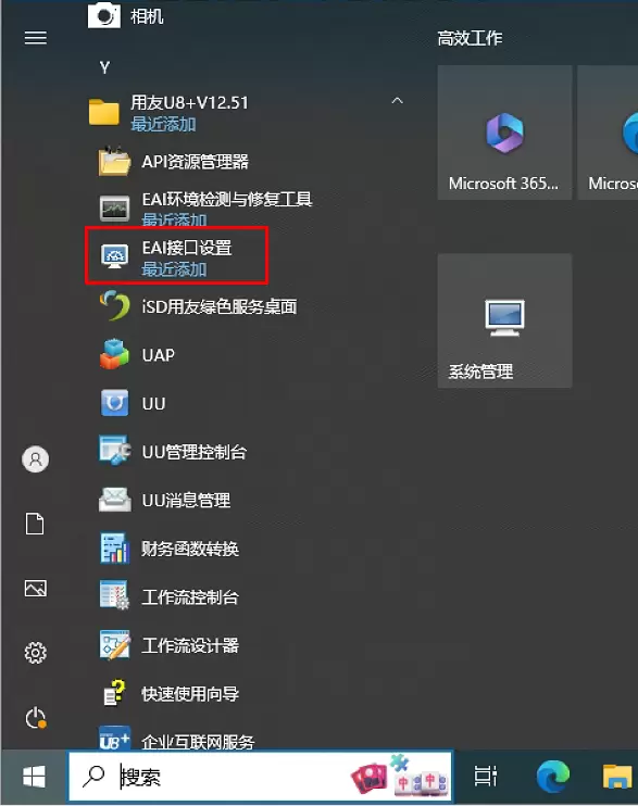 上图所示,需要在安装用友软件的服务器电脑上点击上图红框所示的“EAI接口设置”