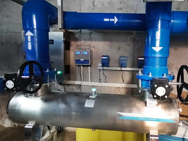 AQUA爱克不锈钢紫外线杀菌器整机主体由304不锈钢打造而成,长期工作不易被腐蚀;搭载进口灯管,使用寿命更长,可迅速杀灭常见病毒细菌,并且物理消毒不会造成二次污染,保障三亚某楼盘小区泳池水质干净卫生,无异味,无刺激。