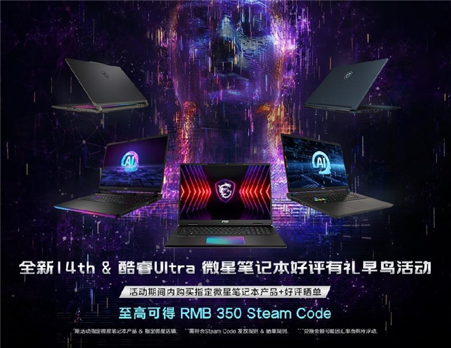 CES发布的新品陆续在中国上市,为了庆祝新品的到来以及回馈钟爱微星笔记本产品的用户,微星打造了“全新14th & 酷睿Ultra”好评有礼早鸟促销活动。此活动从2024年1月9日起至2024年1月29日止,凡在此期间购买指定机型,并且进行好评晒单,就可以获得至高350元的Steam Code代金券。同时,好礼还层层加码,完成晒单并通过审核的龙骑士,还有机会再参与抽奖活动,抽奖奖品为「微星CLAW掌上游戏机*3台 + 微星限量周边好礼」,怎么样?是不是非常具有诱惑力呢?赶快来参加吧!