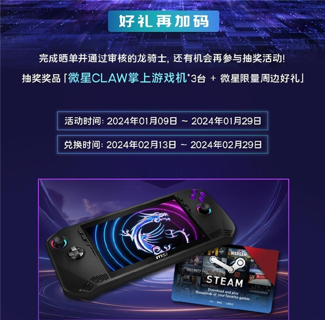 本次CES发布的新品,1月9日陆续开卖。微星还打造了玩家专属的购机、晒单、好评有礼活动,不仅至高可以获得350元的Steam Code代金券,涉及多个系列机型,而且只要通过活动审核的龙骑士,还有机会参与微星Claw掌上游戏机和微星限量周边好礼的抽奖活动,简直是极具诱惑力。当然,活动时间在此提醒下,是2024年1月9日至2024年1月29日,玩家们千万不要错过哟,赶快行动起来吧!