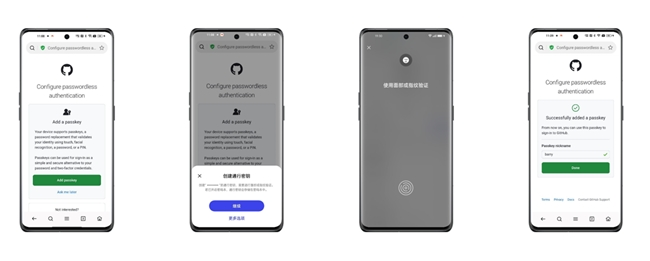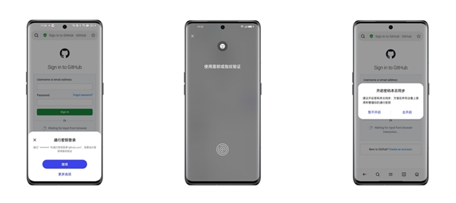 首先,使用OPPO浏览器访问 github 网站,点击网页上的“add a passkey”按钮,再进行一次指纹或者面部校验即可完成Passkey的创建。创建一个密钥的流程和完成手机屏幕解锁的方式一模一样,非常贴近用户日常的使用习惯。