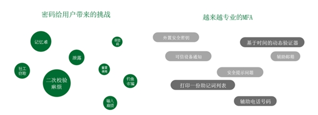 为了提高安全性,开发者通常建议用户设置复杂的密码且在不同应用使用不同的密码,并且会启用多因素验证来加强身份验证的安全性,但这就导致了易用性方面的问题,如: