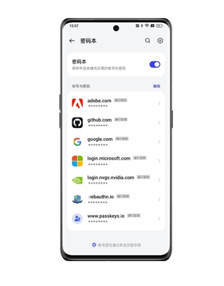OPPO设备创建的Passkeys可以通过基于端到端加密的密码本云同步机制,自动同步到登录相同OPPO账号的其他 OPPO 设备。因此用户的密钥随时可用,即使更换了设备也无需重新创建。从这张OPPO密码本的截图上,可以看到Google、微软的账号都已经接入了Passkeys,用户注册的Passkeys保存在了OPPO密码本中,可随时使用OPPO设备中保存的Passkeys登录Google、微软的账号。