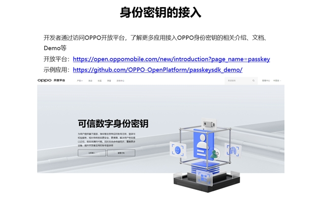 对于开发者来说,通过访问OPPO开放平台,即可了解接入OPPO身份密钥的相关介绍、文档、Demo等详细内容。