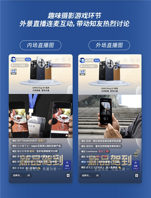 1月9日,在OPPO的全新旗舰Find X7系列手机发布的第二天,知乎新品内容栏目“新品驾到”对该款手机展开直播对谈,邀请多位手机、摄影等领域优秀答主,围绕该款新机的影像表现进行一场挑战活动。截至目前,该期“新品驾到”栏目直播累计播放量达73.6万,栏目相关内容在知乎站内的曝光量超5000万。