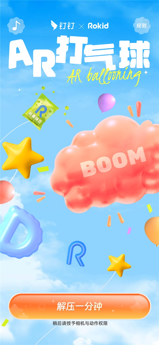 在发布会“五星朋友”开箱环节,钉钉总裁叶军和Rokid创始人祝铭明带着现场观众一起体验了“AR打气球”应用。用户通过钉钉扫一扫,便可以进入一个“虚实融合”的AR世界——五颜六色的气球飘在空中,不时还会跳出其他惊喜道具。360度转动身体和手机,点击气球,积累分数,还可以和同事好友竞争排行,是办公室内休闲解压的必备。